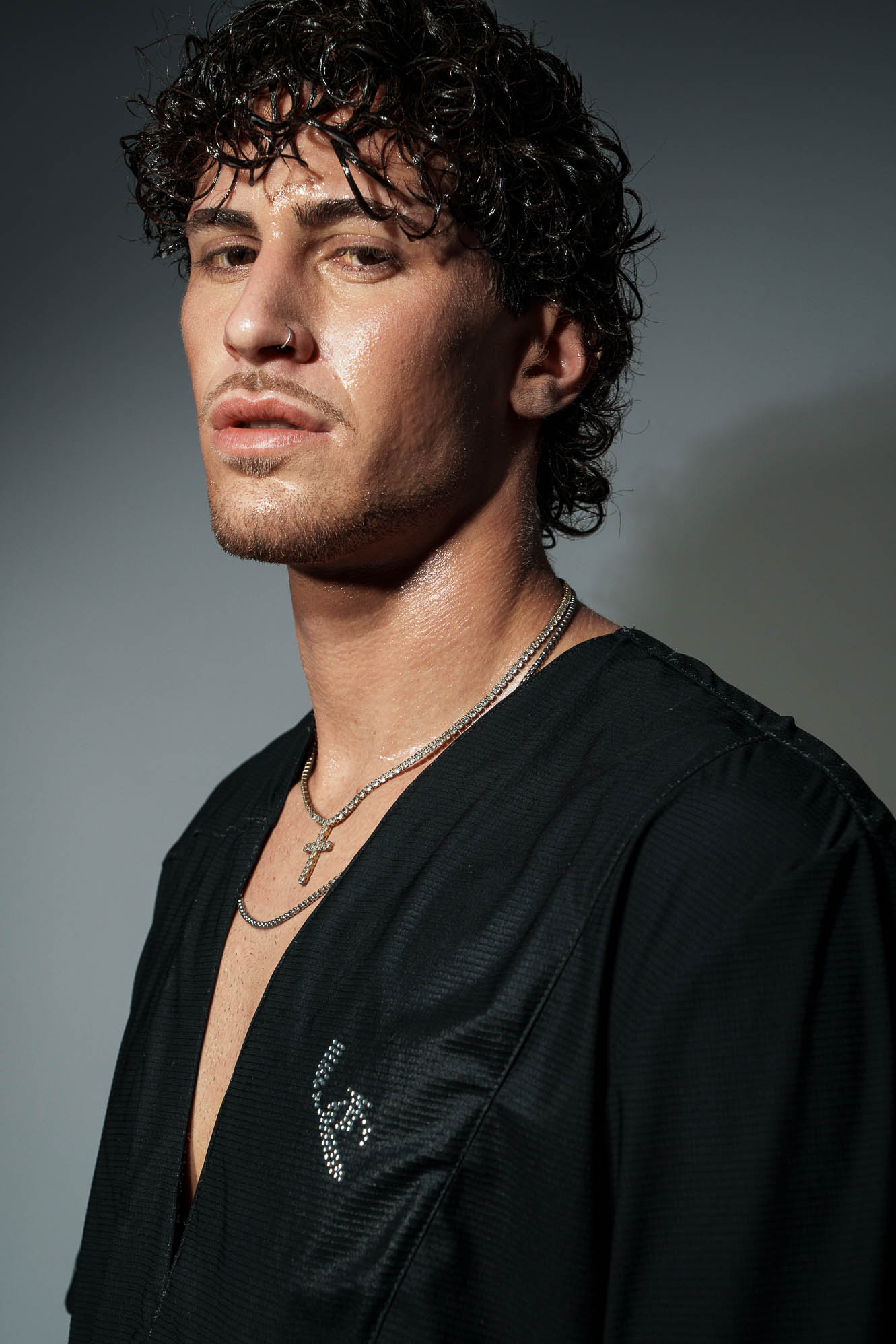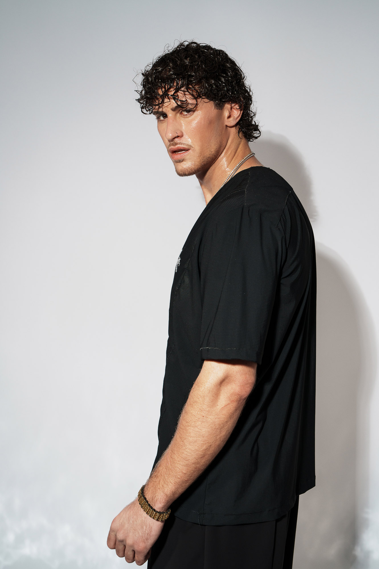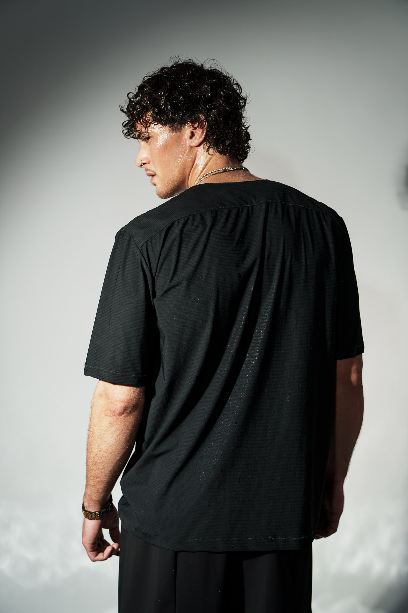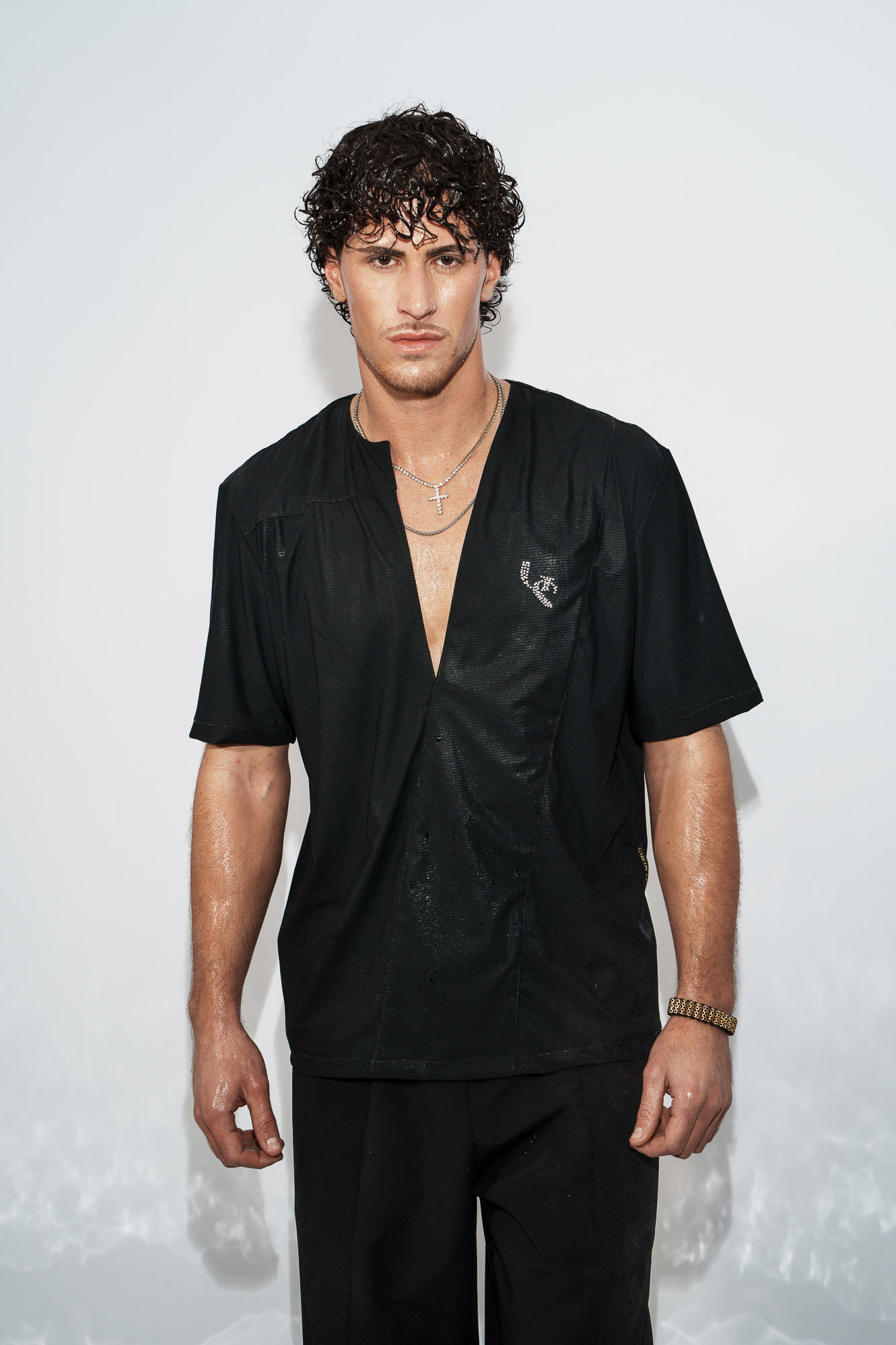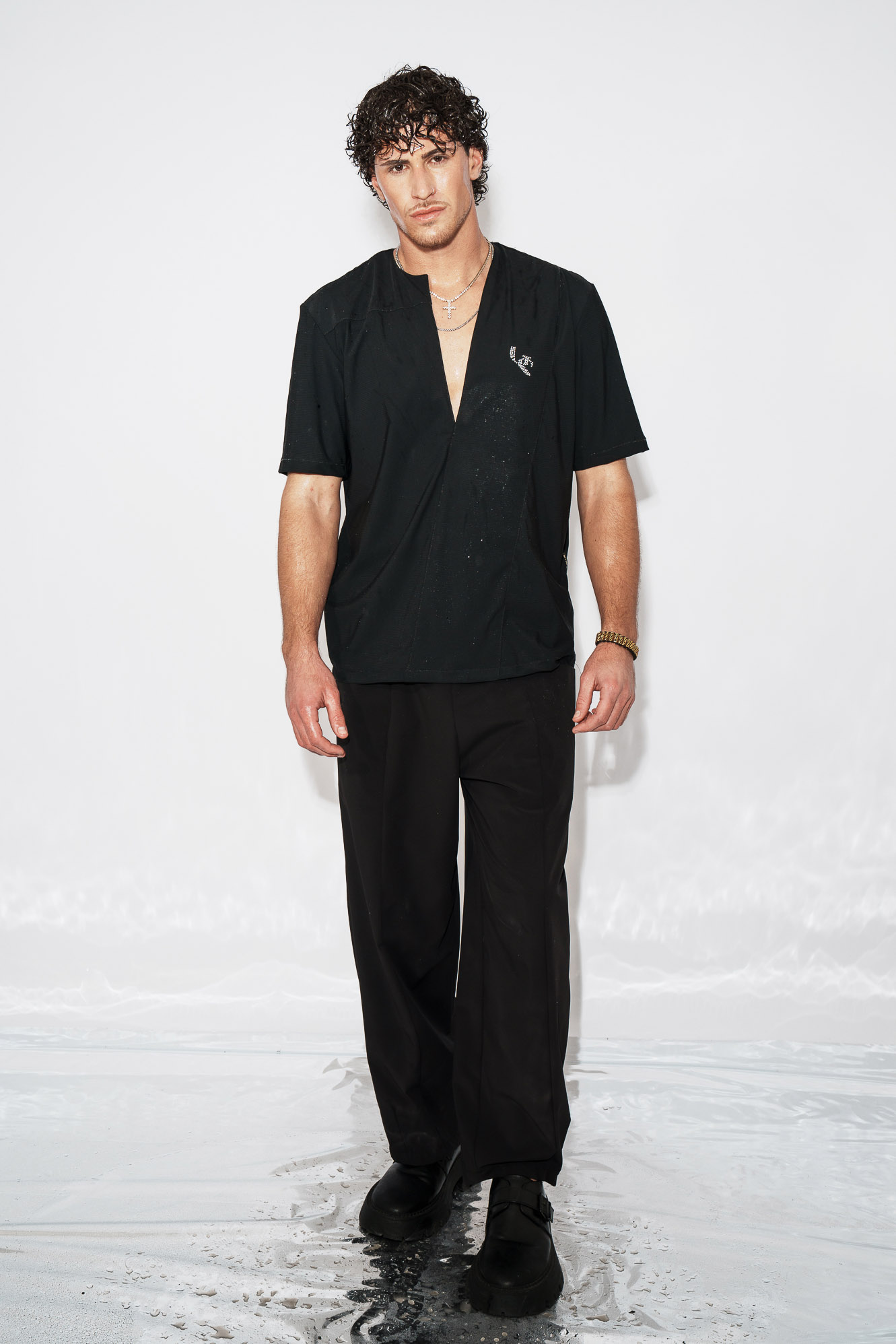 Το χαρακτηριστικό V στο λαιμό ανοίγει όσο χρειάζεται ώστε να αποκαλύπτει το στέρνο με ισορροπία — ποτέ υπερβολικά, ποτέ τυχαία.