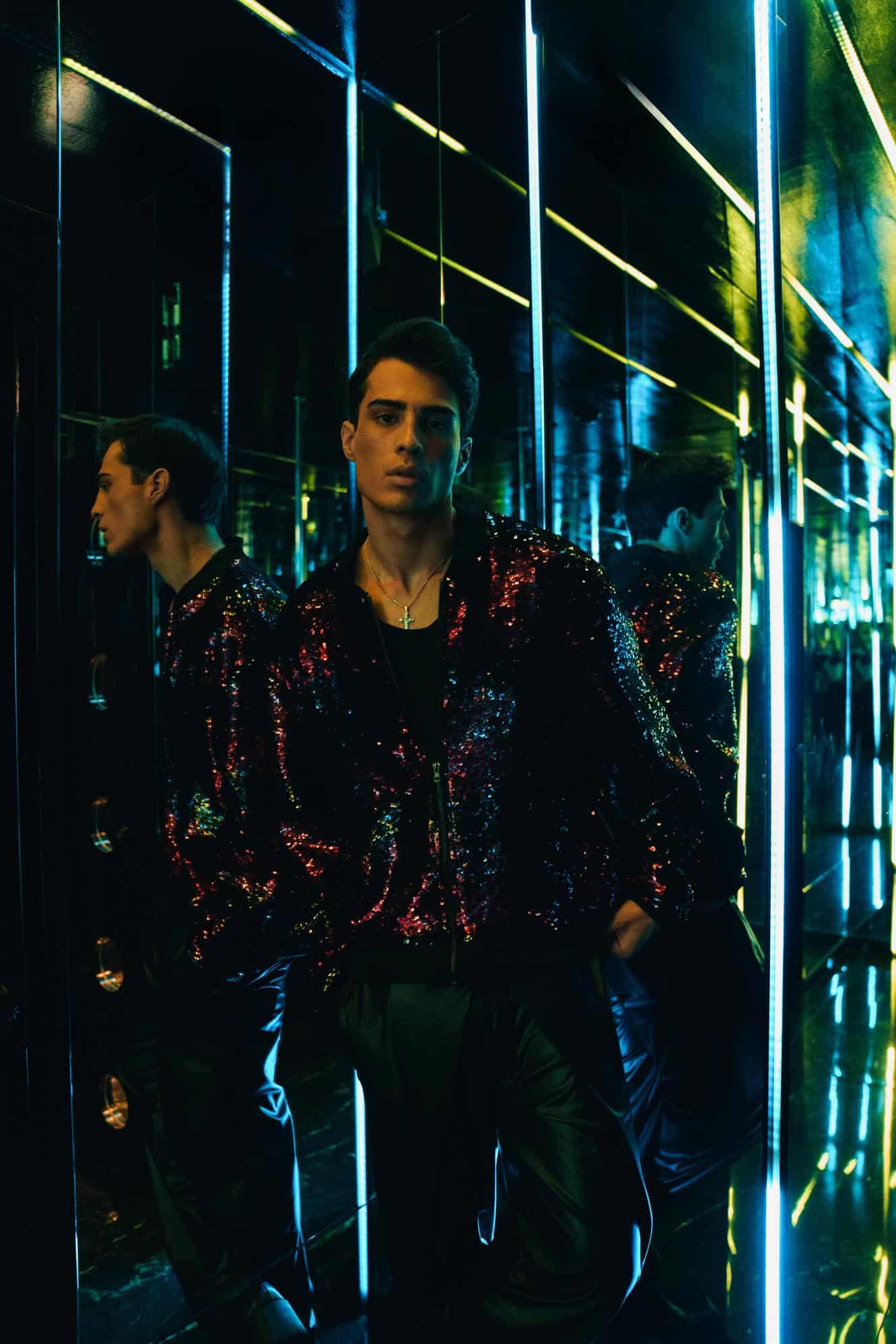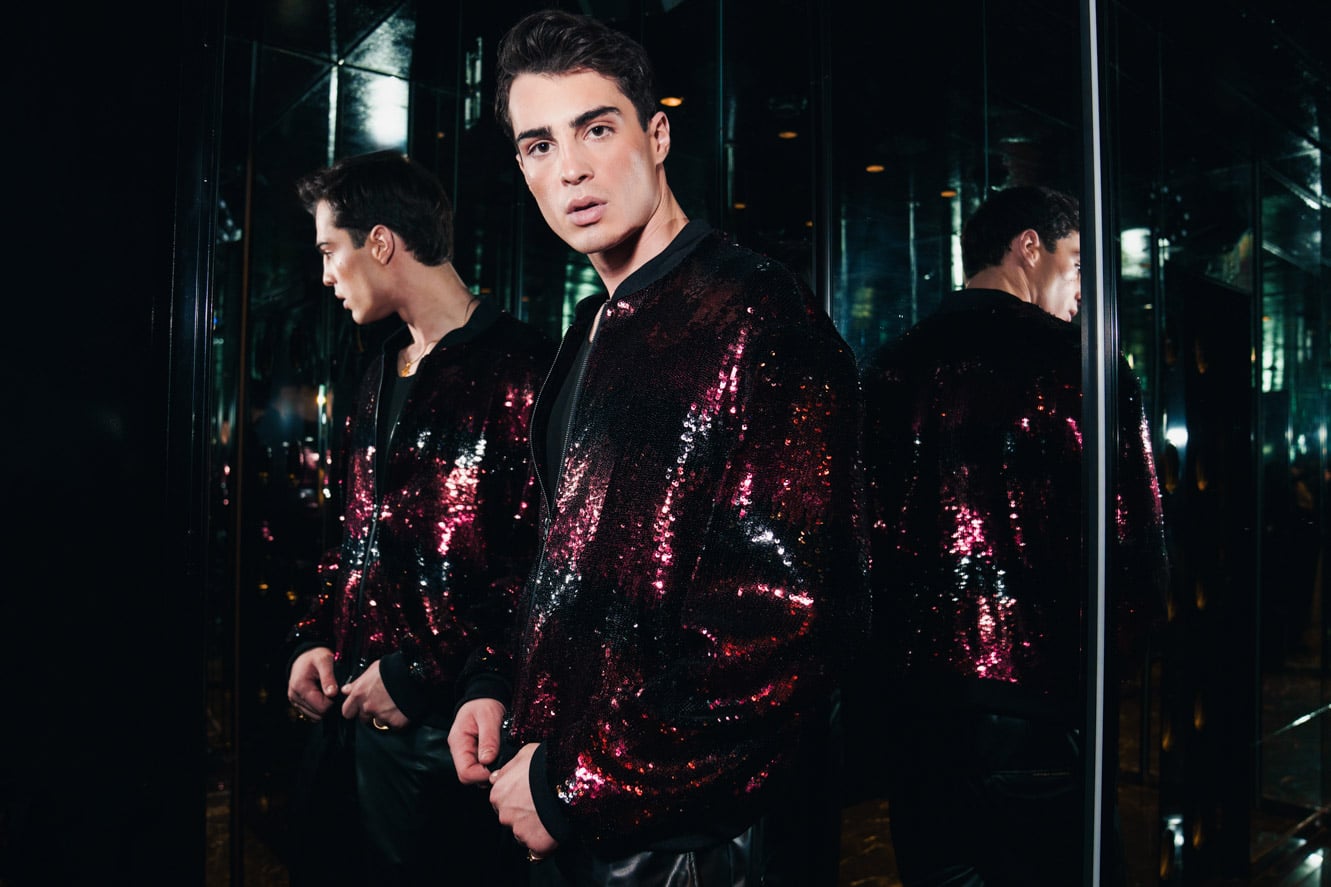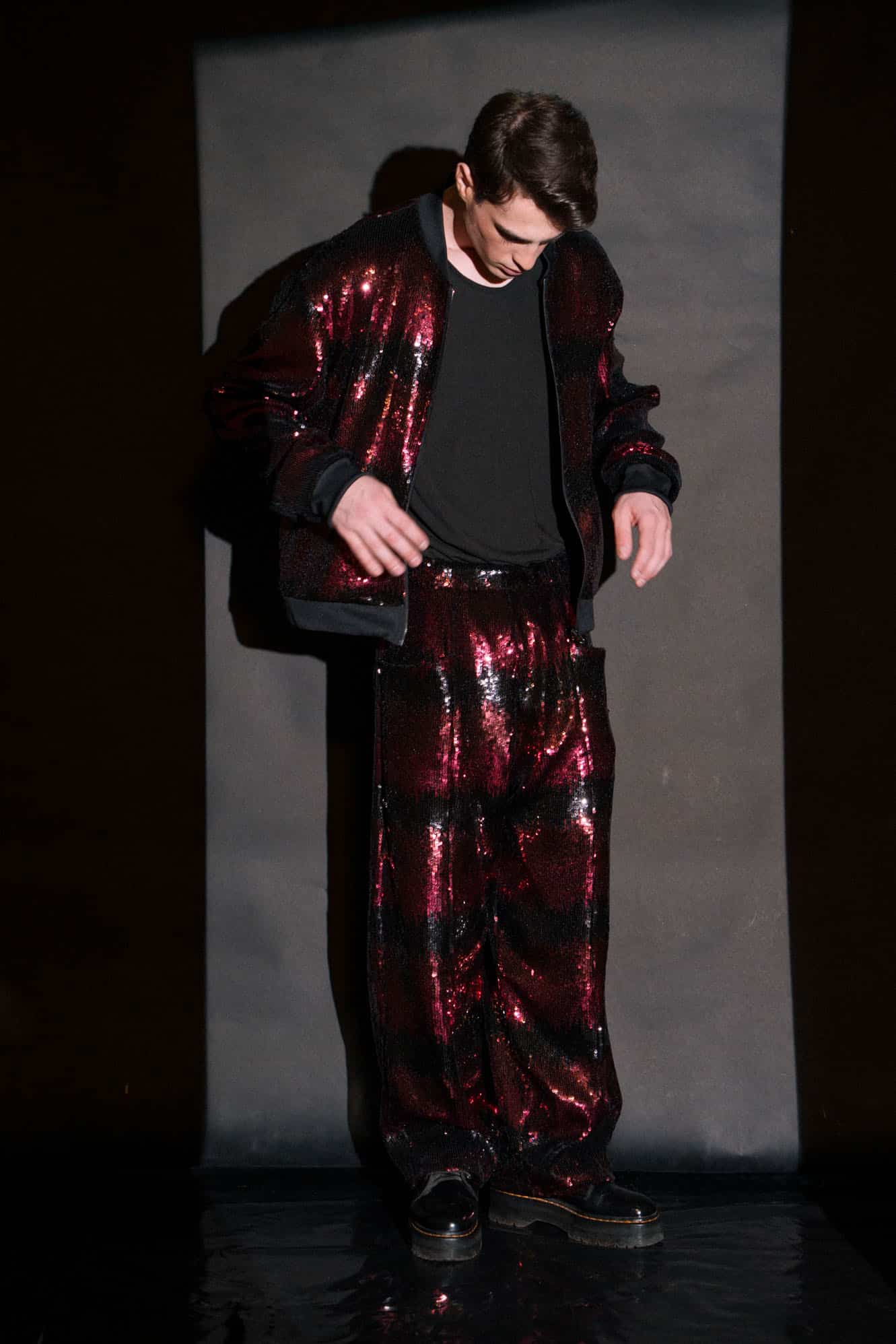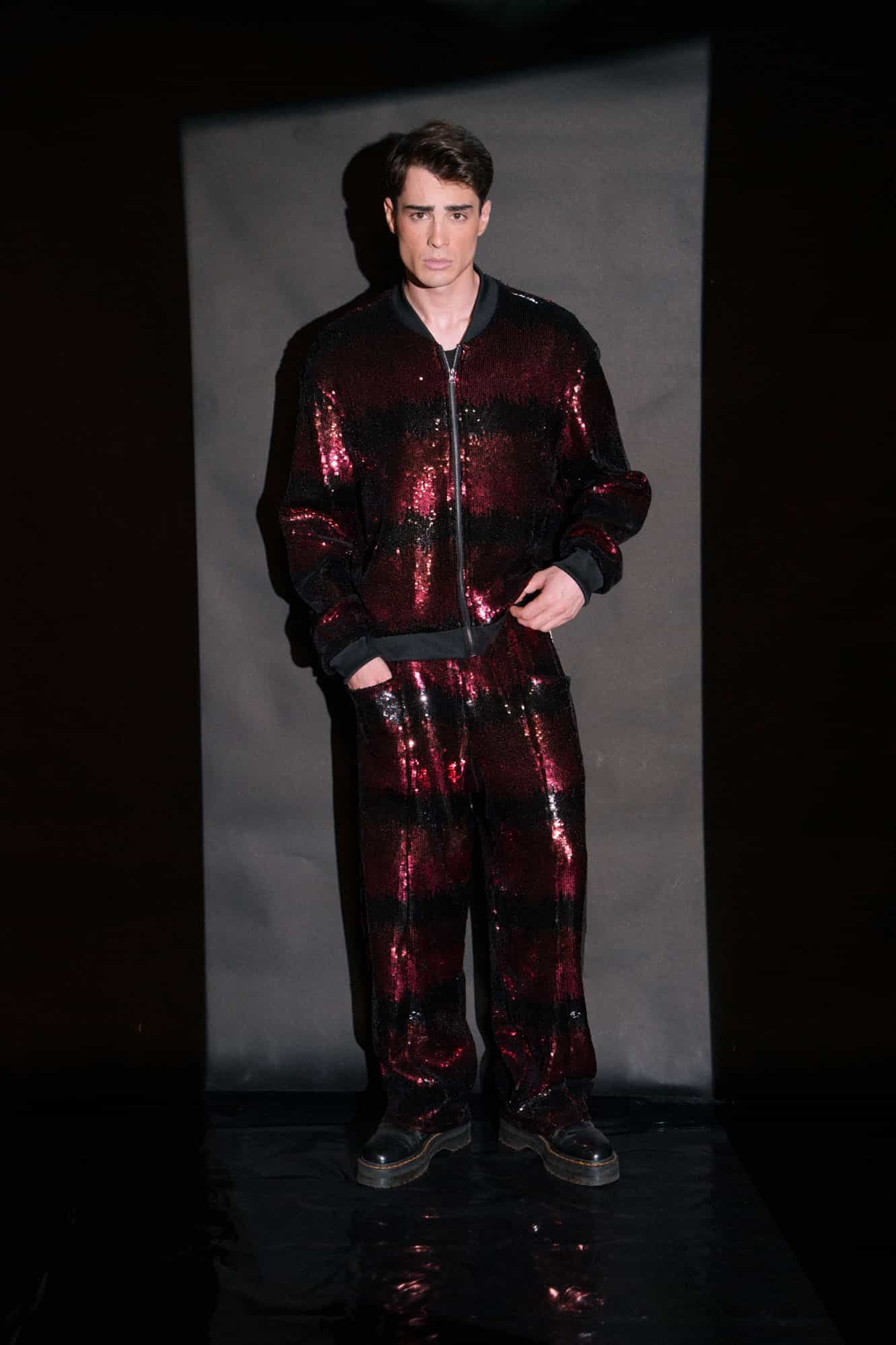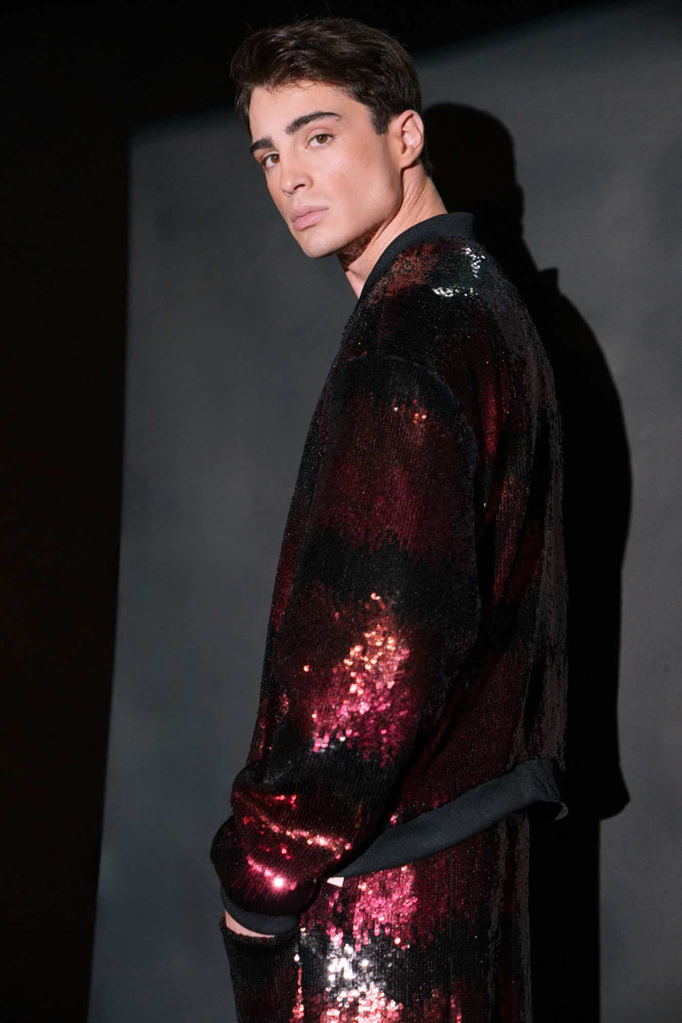 A classic bomber made of sequin red and black fabric with rip elastic on the ends and on the sleeves.