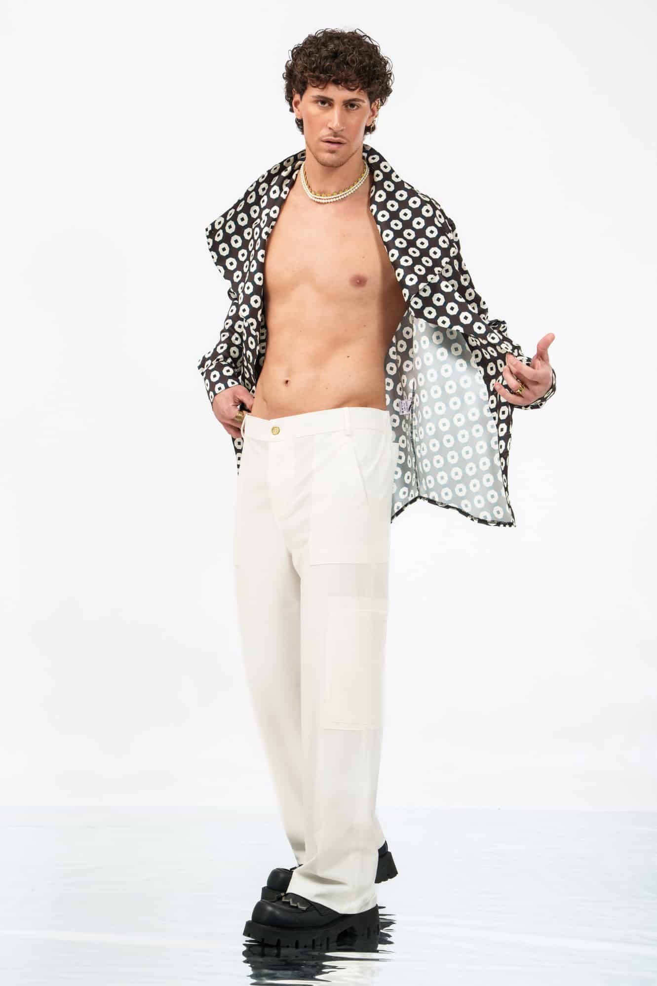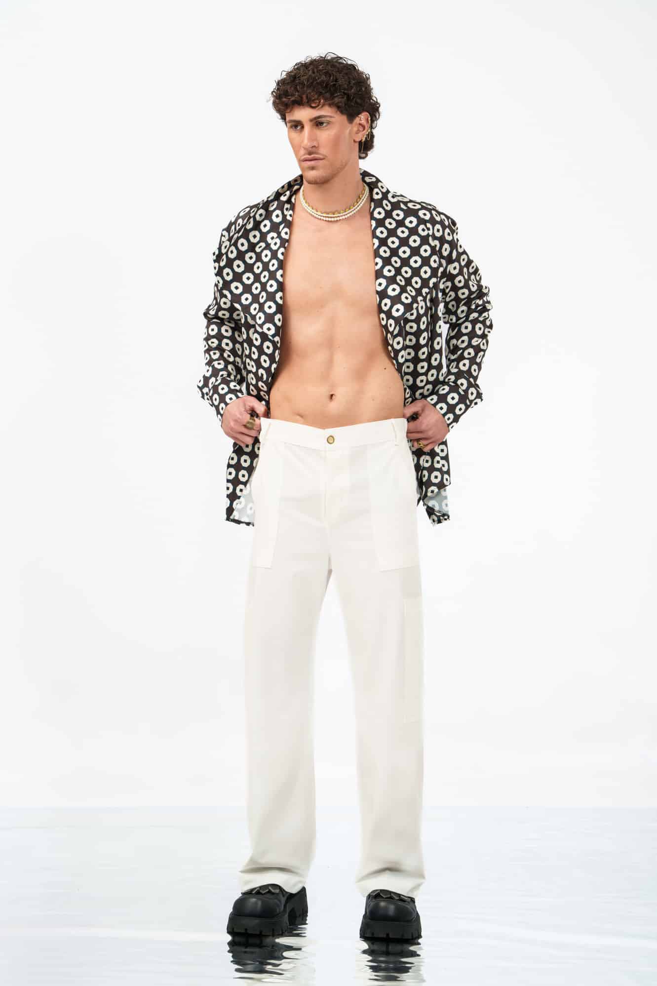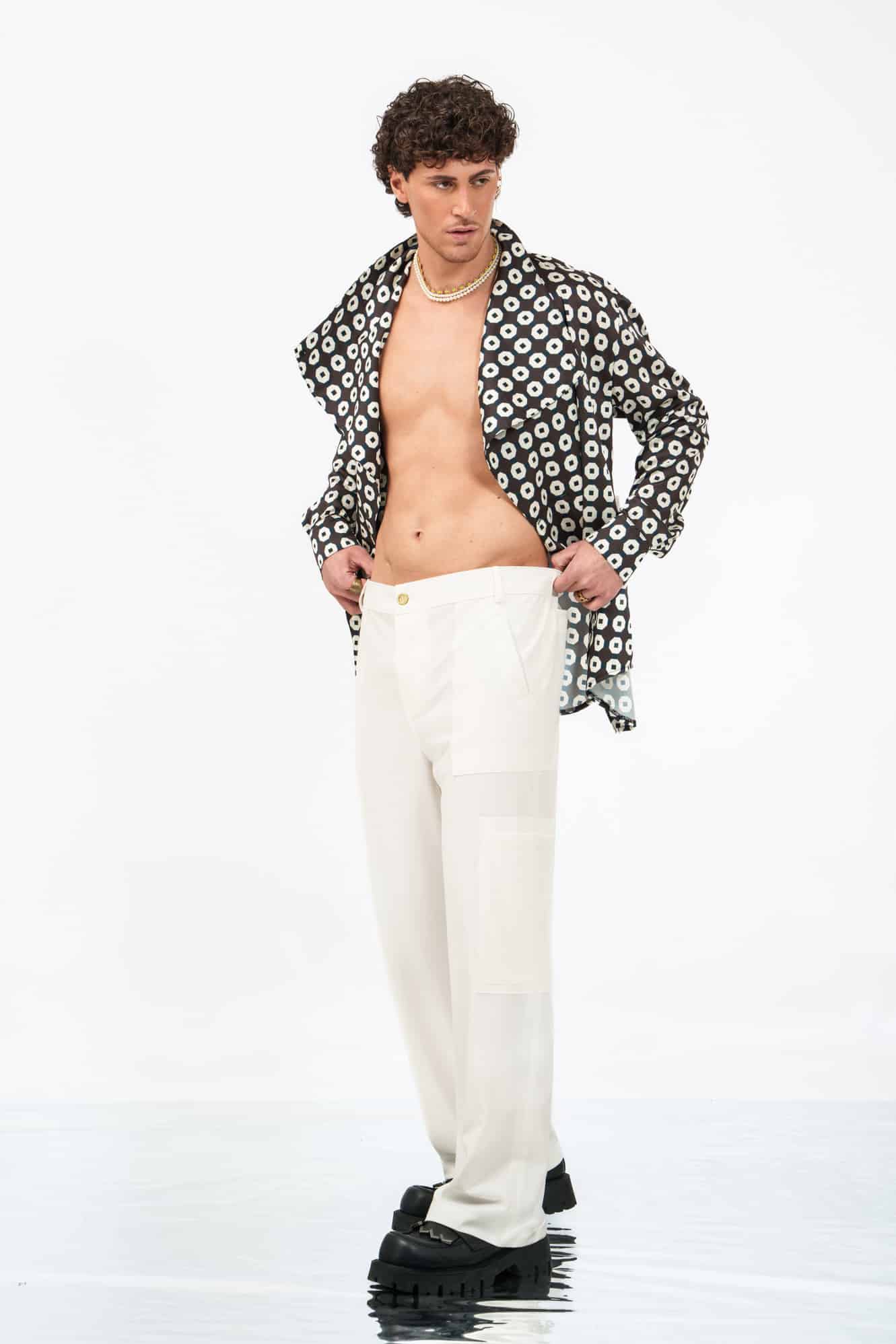 Η ίσια γραμμή διατηρεί το πλάτος της μέχρι τον ποδογυρό, δημιουργώντας ένα καθαρό και ισορροπημένο αποτέλεσμα. Εμπνευσμένο από το thai παντελόνι αλλά πλήρως επαναπροσδιορισμένο, το κομμάτι αποκτά έντονη ταυτότητα μέσα από την τεχνική του λεπτομέρεια.