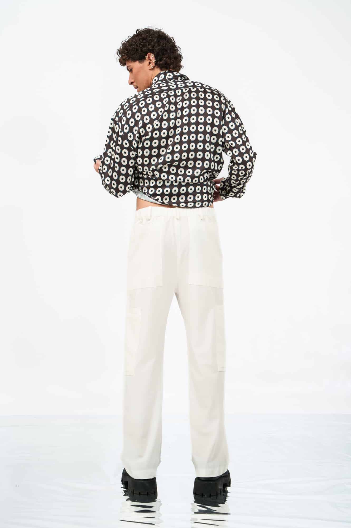 Στην λευκή εκδοχή του, το Frame Pants αποκαλύπτει πλήρως την αρχιτεκτονική του σχεδίου. Κάθε ραφή, κάθε στοιχείο του patchwork γίνεται ορατό μετατρέποντας την κατασκευή σε statement.