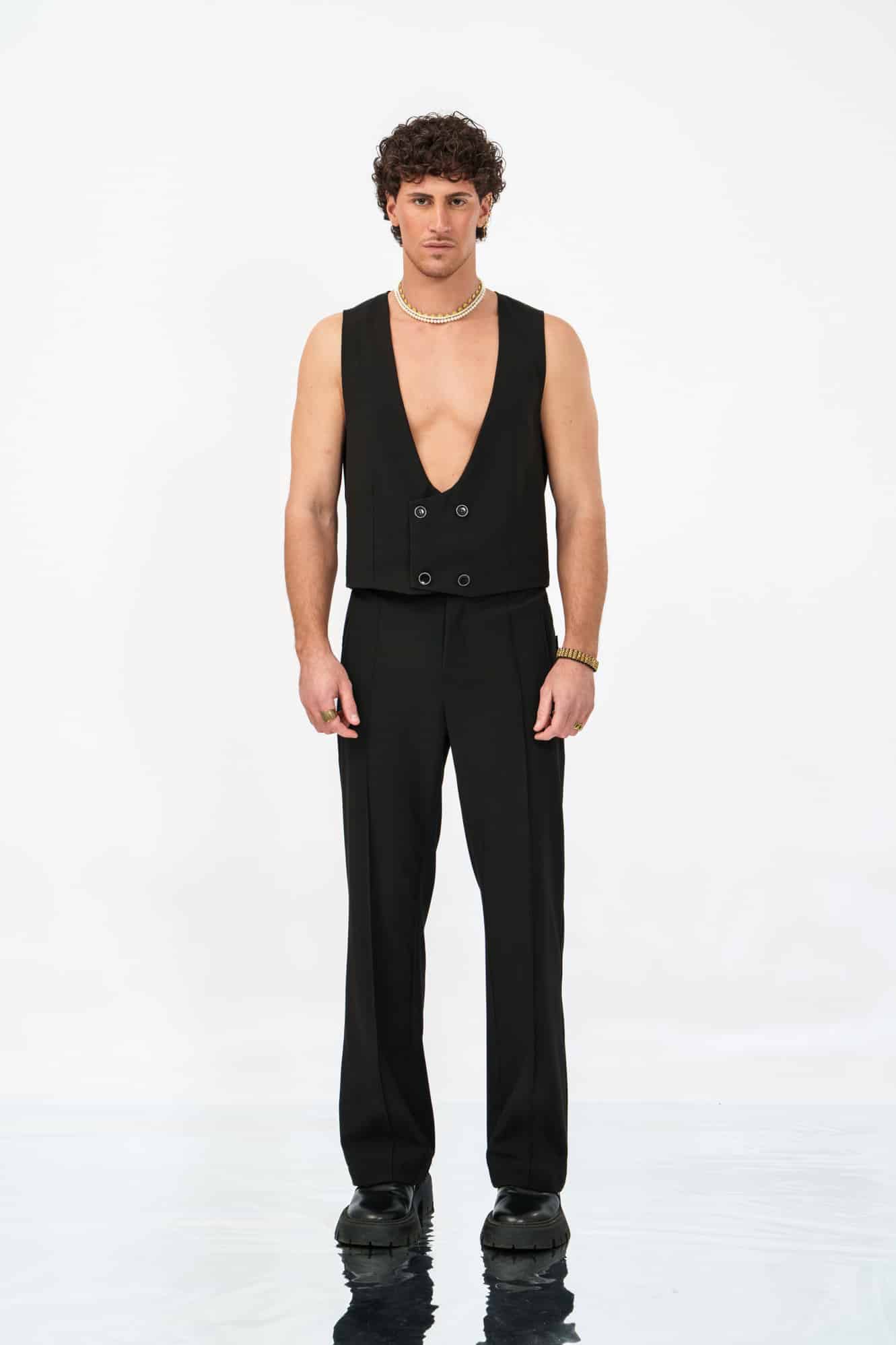 Κατασκευασμένο από πολυτελές κοστουμόπανο τεσσάρων εποχών, “ρέει” στο σώμα διατηρώντας παράλληλα τη δομή του, δημιουργώντας ένα επιμηκυμένο, refined αποτέλεσμα.