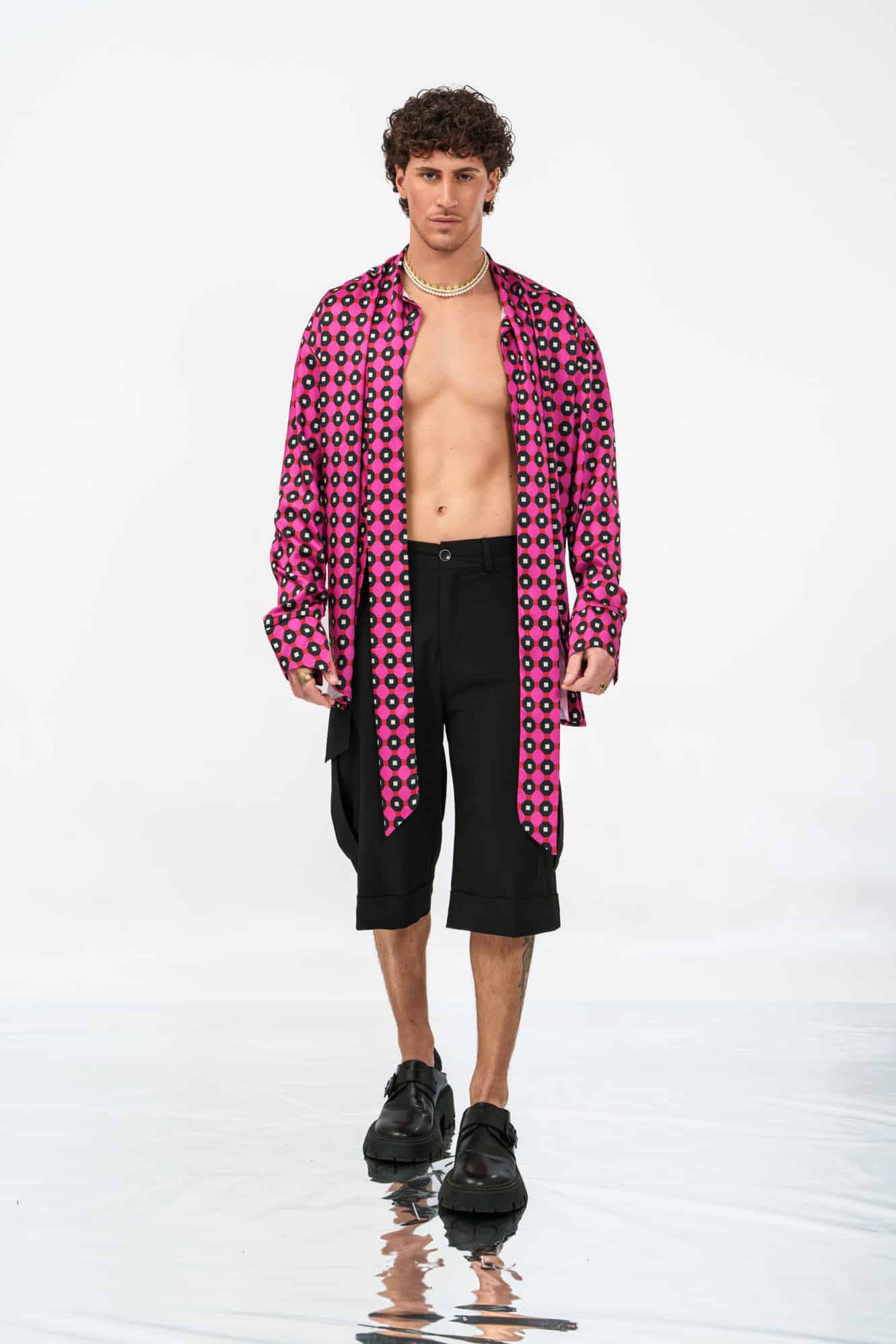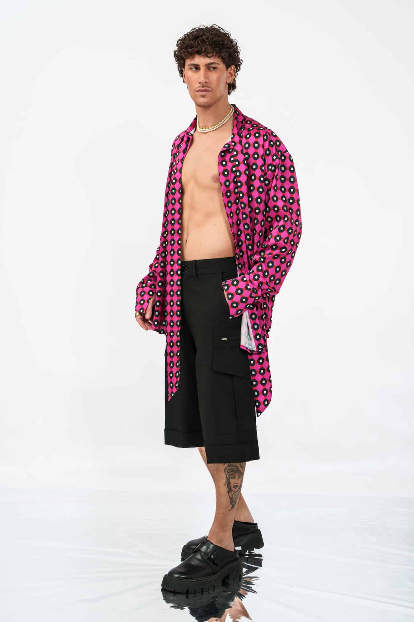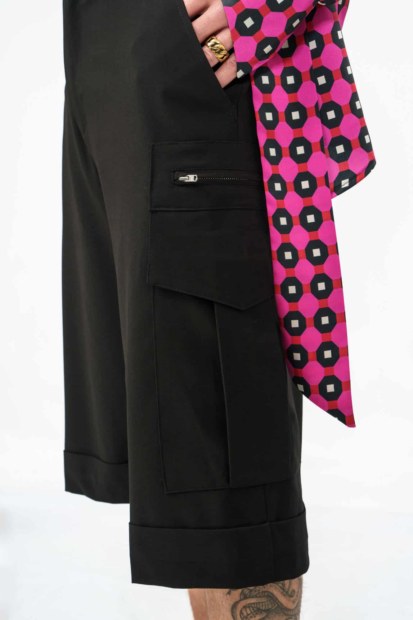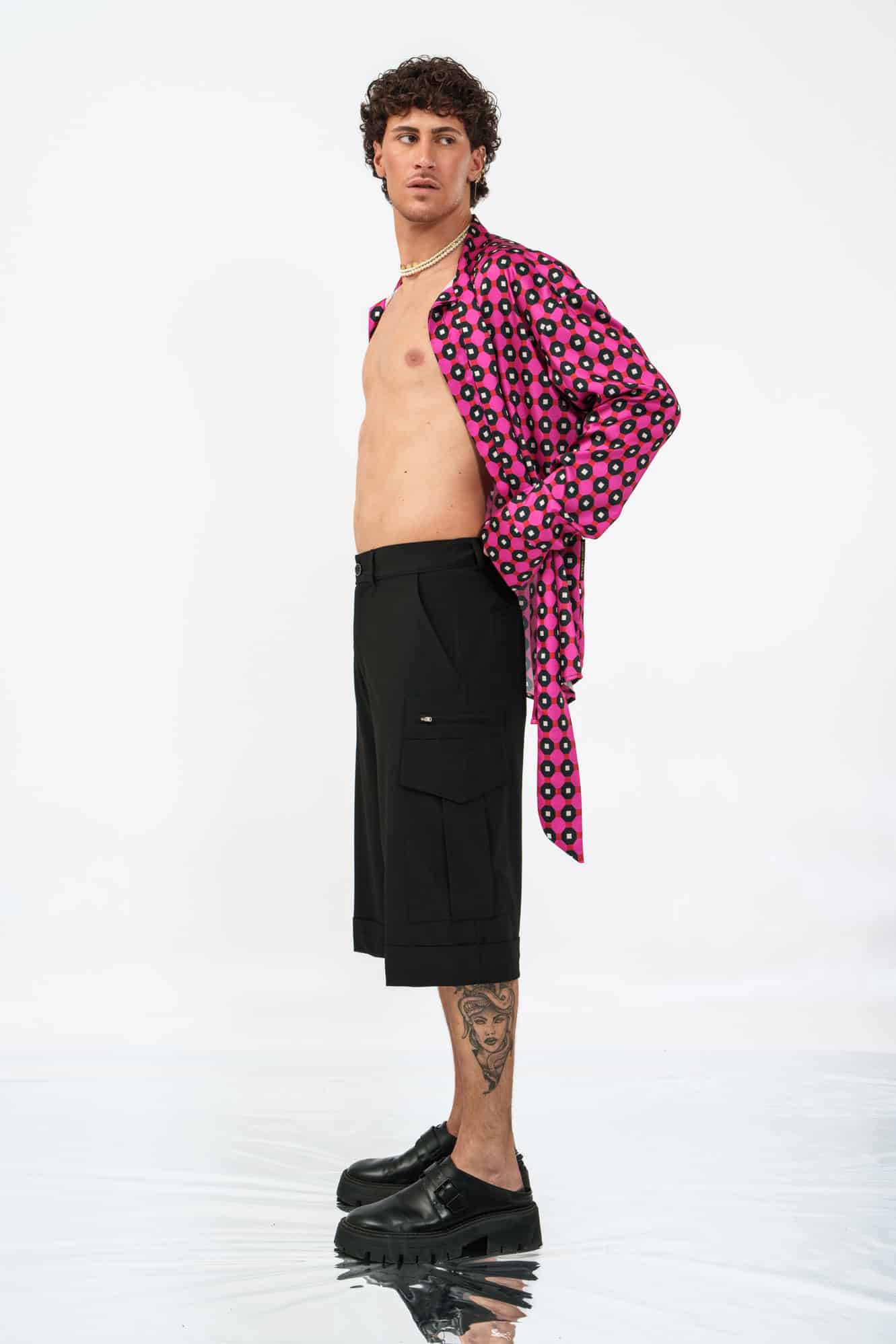 Το Riviera Shorts σε μαύρο αποτελεί μια δυναμική επανερμηνεία της κλασικής cargo βερμούδας. Με μακρύ tailored μήκος που φτάνει μέχρι τη μέση της γάμπας, δημιουργεί μια έντονη, σύγχρονη σιλουέτα.