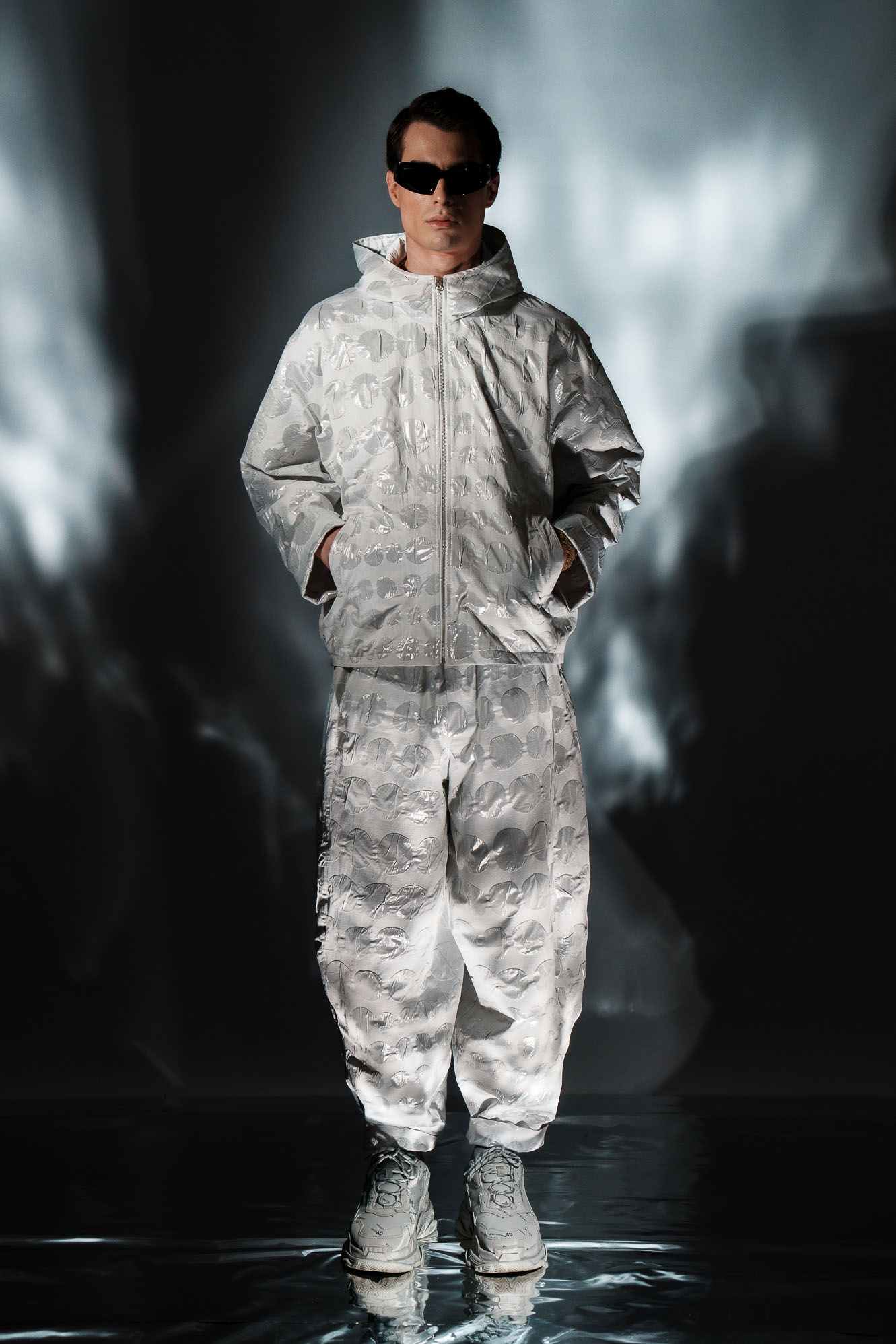 Η ζακέτα No Permission και το Outside Rules pants μοιράζονται το ίδιο μπροκάρ ύφασμα σε ψυχρό λευκό του πάγου, με γεωμετρικούς κύκλους που εναλλάσσονται ανάμεσα σε ματ και foil επιφάνειες.