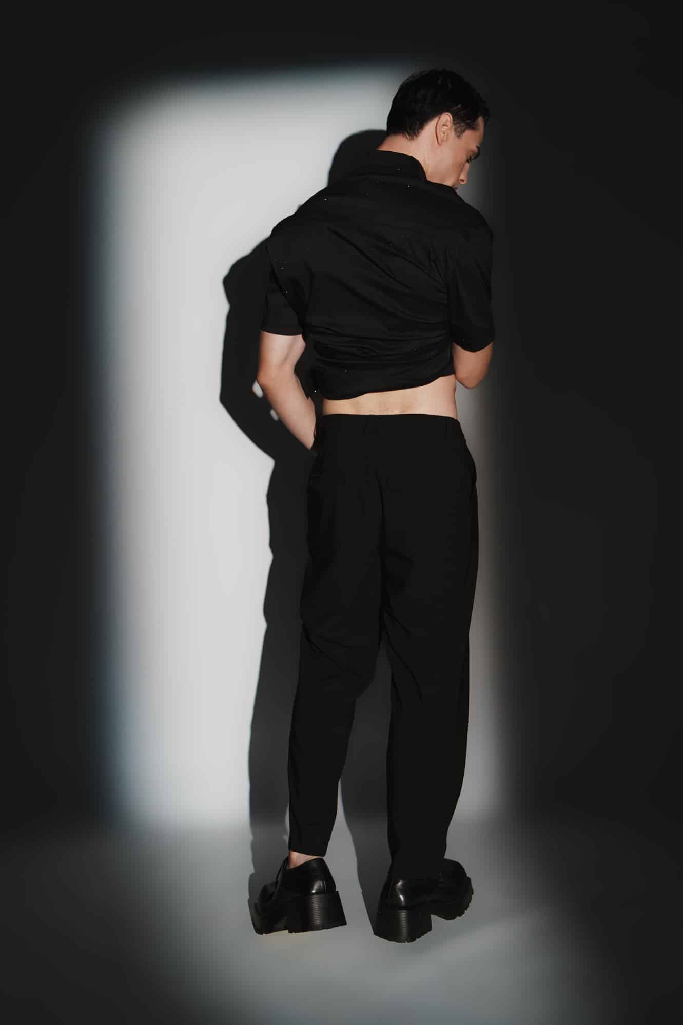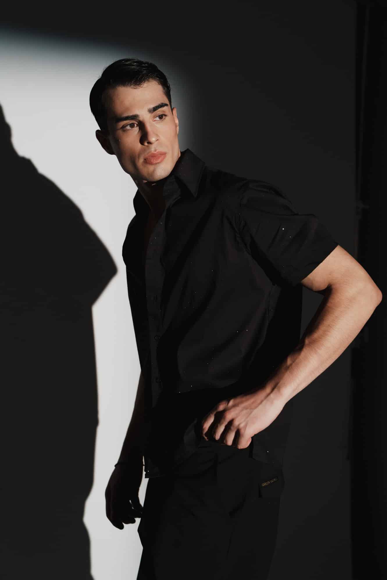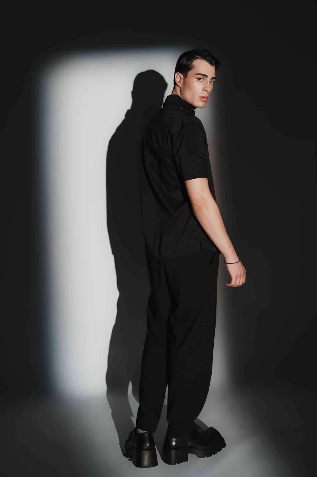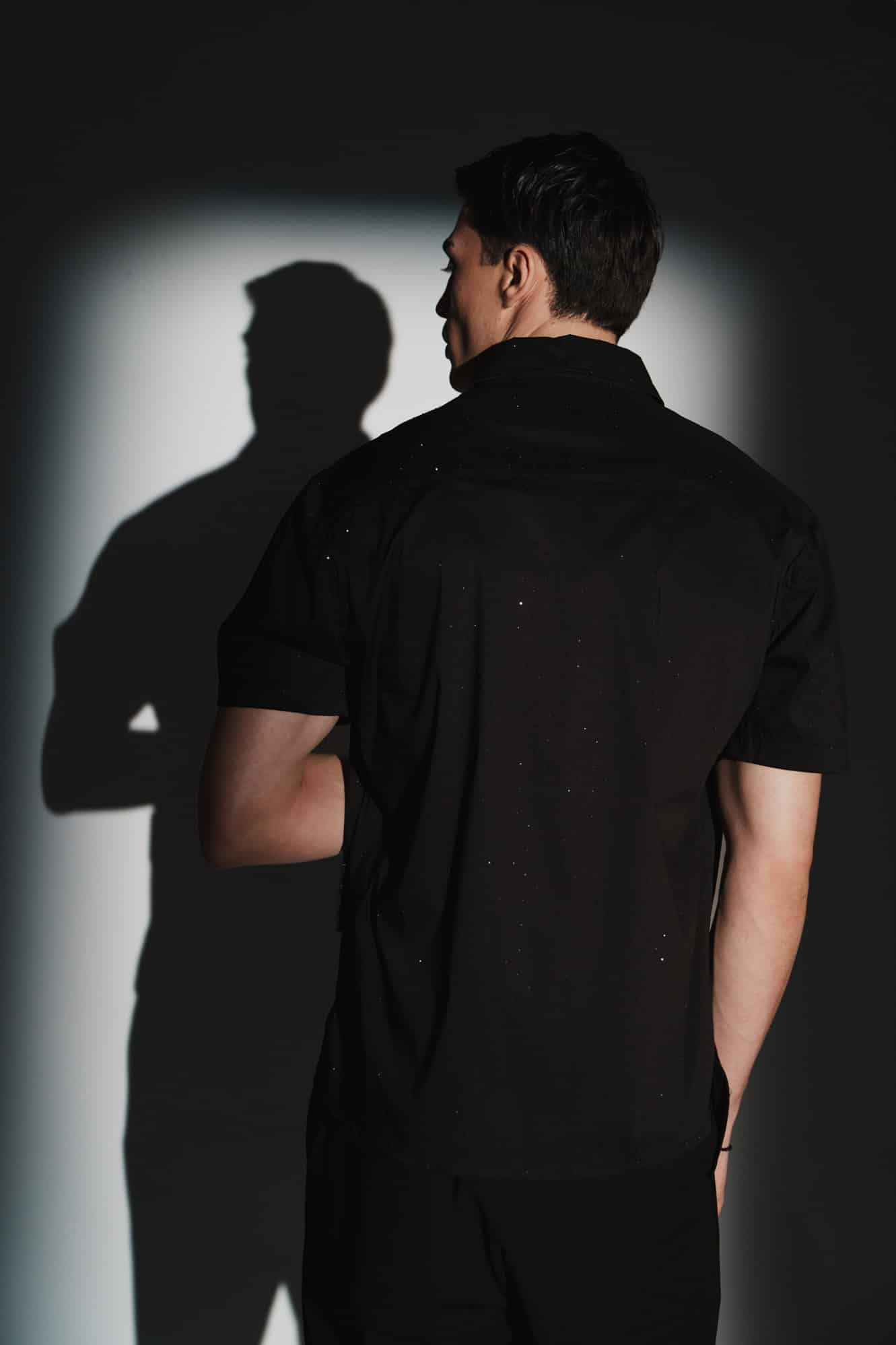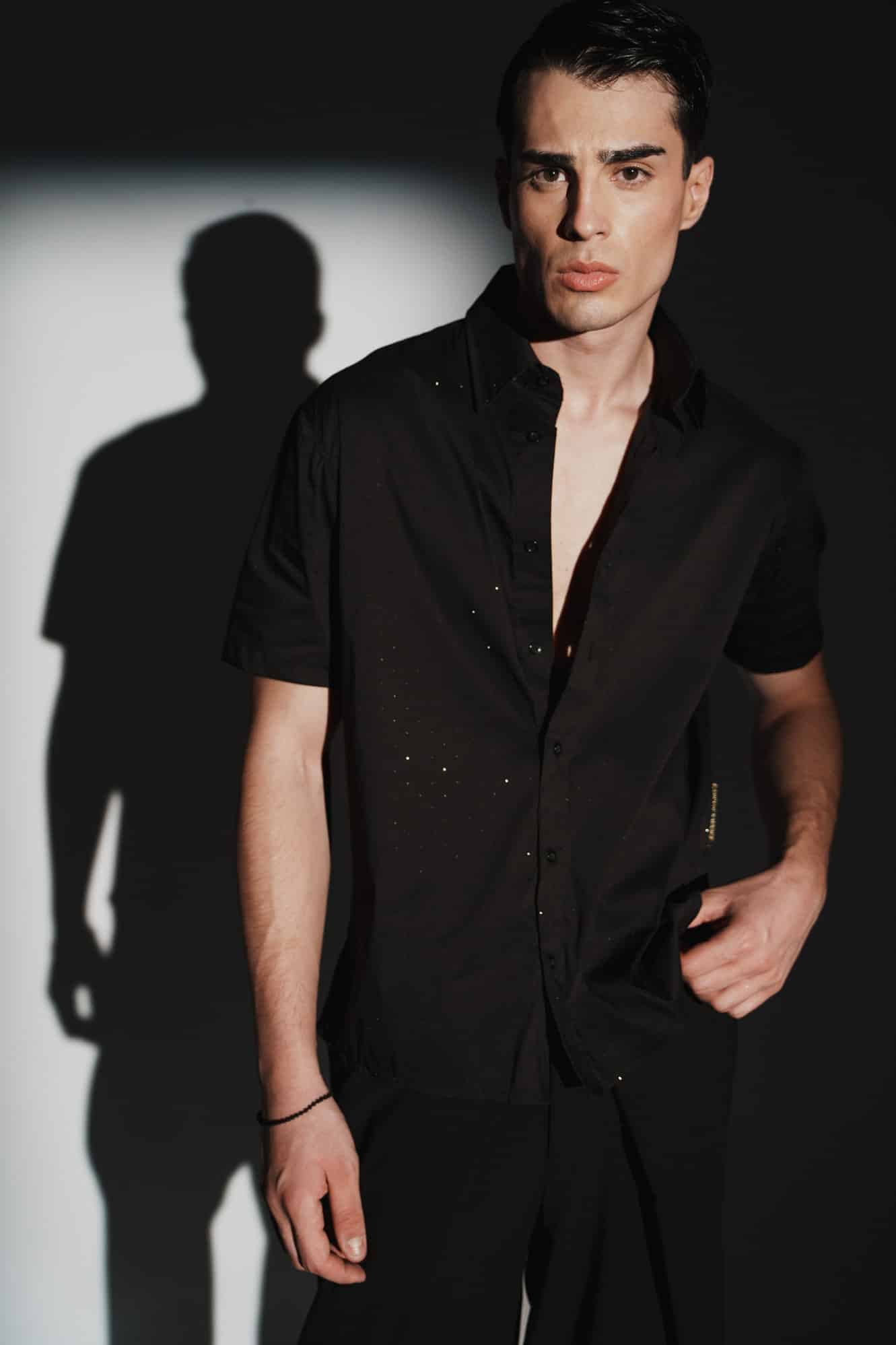 Α classic oversized short sleeve button up shirt, made of elastic cotton poplin with black rhinestones on the surface that gives an amazing sparkle.