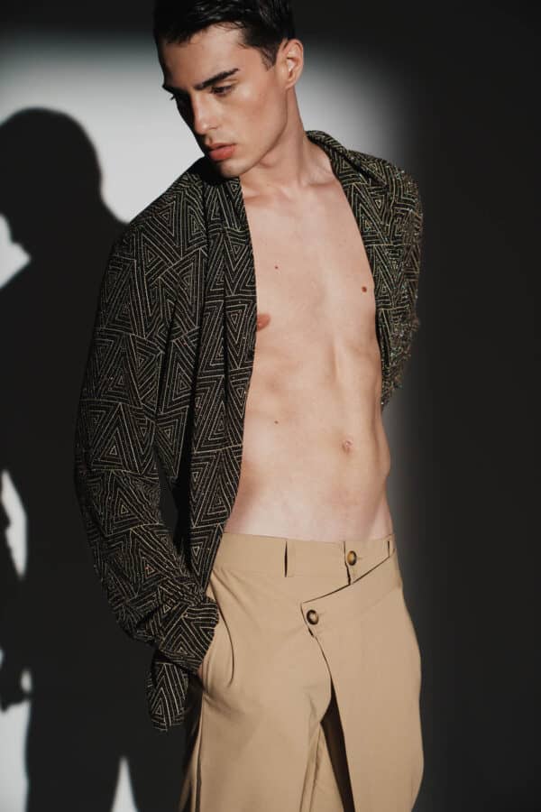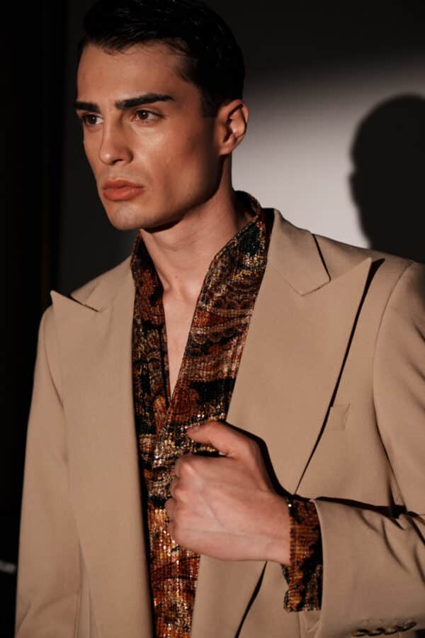 A V-neck dress shirt made from structured, sequence fabric, designed to be worn as with or without a suit. Its clean cut and distinctive material elevate the classic dress shirt, adding character and sparkle.